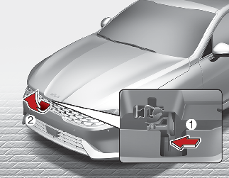 Go to the front of the vehicle, raise the hood slightly, push the secondary hood release lever (1) up side and lift the hood (2).