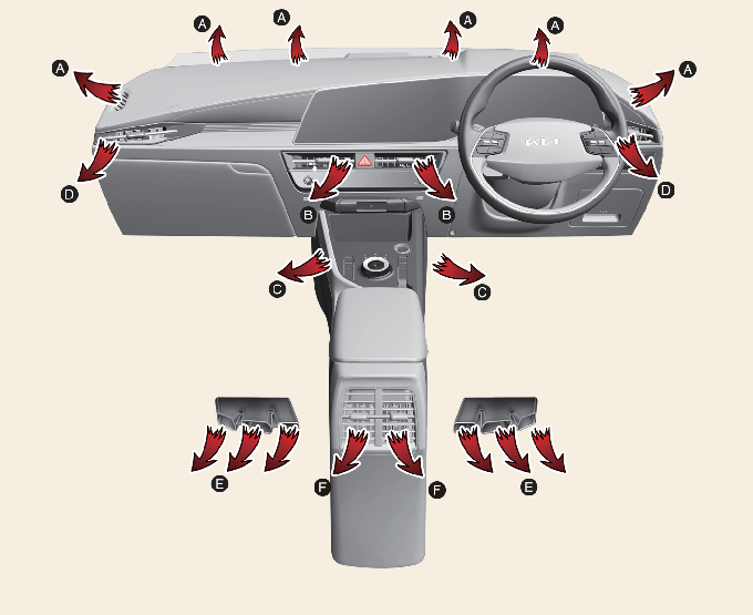 Cea mai mare parte a fluxului de aer este direcționat către podea, cu o cantitate mică de aer direcționată către parbriz, degivrarea geamurilor laterale și aerisirile laterale. |