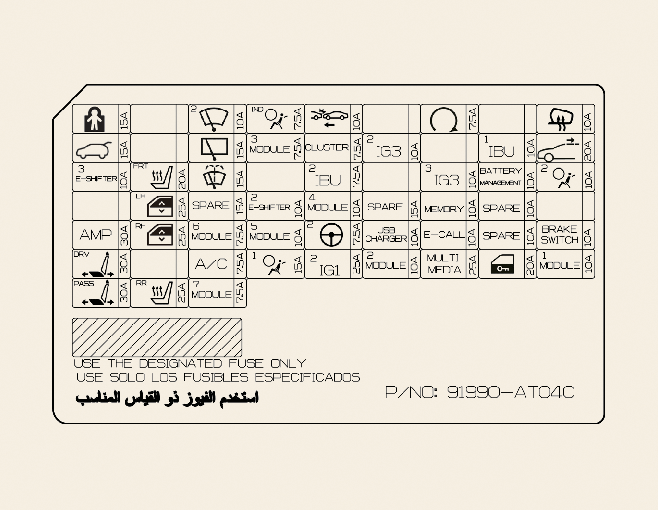 Inside the fuse/relay panel covers, you can find the fuse/relay label describing fuse/relay name and capacity.