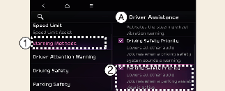 Įspėjimo intensyvumas: Informacijos ir pramogų sistemoje pasirinkite Nustatymai → Transporto priemonė → Pagalba vairuotojui → Įspėjimo metodai → Įspėjimo intensyvumas ir sureguliuokite įspėjimo garsumą.