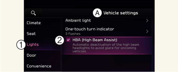 Norėdami įjungti tolimųjų šviesų perjungimo sistemą, automobiliui esant įjungtam, pasirinkite Naudotojo nuostatos → Žibintai → HBA (tolimųjų šviesų perjungimo sistema) prietaisų skydelyje arba Sąranka → Transporto priemonė → Žibintai →HBA (tolimųjų šviesų perjungimo sistema) informacijos ir pramogų sistemoje.