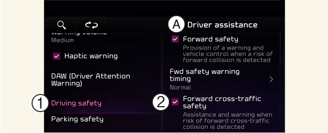 Esant įjungtam automobiliui, informacijos ir pramogų sistemos ekrane pasirinkę Nustatymai → Transporto priemonė → Pagalba vairuotojui → Važiavimo sauga → Skersinio eismo sauga priekyje galite įjungti važiavimo per sankryžą funkciją ir atšaukti parinktį, kad išjungtumėte ją.