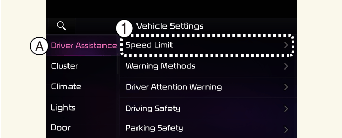Kai transporto priemonė įjungta, pasirinkite Naudotojo nustatymai → Pagalba vairuotojui → Greičio apribojimas prietaisų skydelyje arba Nustatymai → Transporto priemonė → Pagalba vairuotojui → Greičio apribojimas Informacijos ir pramogų sistemoje.