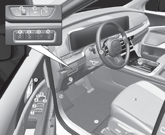 * 실제 차량과 다를 수 있습니다. (스위치의 형상 및 배열은 사양 적용에 따라 달라질 수 있습니다)