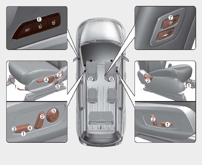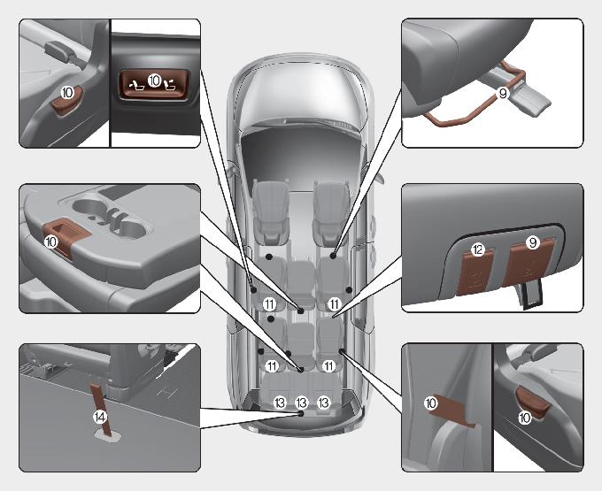 * 9인승 차량은 2, 3열 시트의 센터 점프시트가 없습니다.