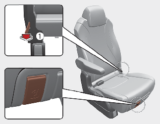 시트 등받이 뒤쪽의 시트 접이 끈(2)을 당기면 등받이가 접히면서 시트 전체가 차량 바닥으로 접히며 가라앉습니다.