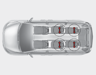 어린이 보조 시트를 고정할 수 있는 상부 부착구(후크 고정용)가 11인승 차량에는 2열 시트 쿠션 뒤쪽 중앙에, 9인승 차량의 경우에는 2, 3열 시트 쿠션 뒤쪽 중앙에 위치해 있습니다.