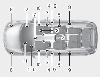 에어백이 작동될 때 부상과 사망의 위험성을 줄이기 위하여 차량을 제어할 수 있고 편안한 자세를 유지할 수 있는 한, 스티어링 휠에 장착된 에어백과 운전자의 가슴 사이가 최소한 약 25 cm 이상 떨어지도록 멀리 앉고, 동승석에서는 가능한 시트를 뒤로 이동시켜 바른 자세로 앉으십시오.
