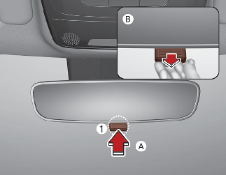 야간 주행 시 주·야 변환 레버(1)를 운전자 방향으로 당기면 뒤 차량의 전조등 불빛으로 인한 눈부심을 줄일 수 있습니다.