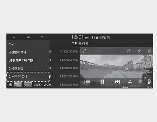 인포테인먼트 시스템 홈 화면에서 빌트인 캠을 선택한 후, 빌트인 캠 설정 → 녹화 → 주행 중 녹화 또는 주차 중 녹화를 차례로 선택하십시오. 주행 및 주차 시 녹화 방법을 선택할 수 있습니다.