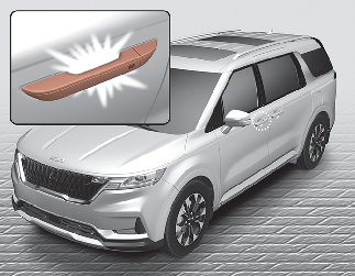 계기판 또는 인포테인먼트 시스템의 사용자 설정 메뉴에서 '웰컴 미러/라이트'의 '운전자 접근 시'가 설정되어 있을 경우, 스마트키를 휴대하고 도어 바깥 손잡이에 1 m 이내 접근하면 켜집니다.