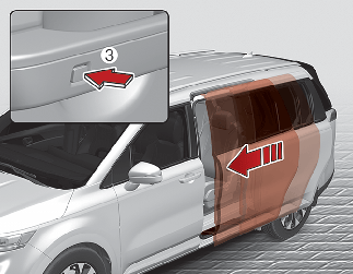 파워 슬라이딩 도어를 닫을 때는 바깥 손잡이(1)를 당기거나 바깥 손잡이 버튼(3)을 누르면, 도어가 자동으로 닫힙니다. (사양 적용 시)