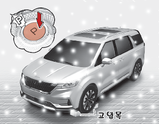 매우 추운 날씨의 주정차 시 주차 브레이크를 작동해 놓으면 브레이크 장치가 얼어 붙어버릴 우려가 있으므로 주차 브레이크는 가능한 풀어놓은 상태에서 주차하십시오. 경사가 없는 평지에서는 변속 위치를 「P」(주차) 위치로 하고, 타이어에는 고임목을 받쳐 차가 움직이지 않도록 하십시오.