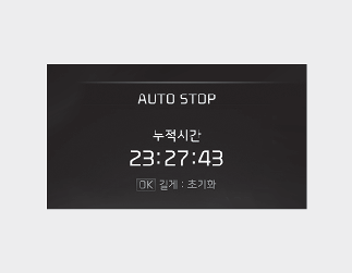 AUTO STOP 누적 시간은 시:분:초로 표시됩니다. AUTO STOP 누적 시간은 초기화하기 전까지 누적되며 스티어링 휠의 「OK」 버튼을 길게 누르면 초기화됩니다.