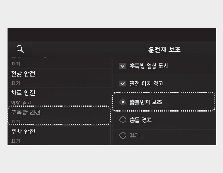 '충돌 경고'를 선택하면 충돌 위험 상황에 따라 경고음이 울립니다. 제동을 도와주지 않으므로 운전자가 직접 차량을 조작해야 합니다.
