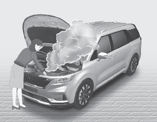 냉각수나 뜨거운 증기가 냉각수 탱크에서 흘러 나오면, 시동을 끄고 자사 직영 서비스센터 또는 서비스협력사에 연락하십시오. 냉각수가 흘러나오지 않으면, 엔진을 계속 돌게 한 상태에서 후드를 열어 엔진 실내에 통풍이 잘 되도록 하여 엔진을 식히십시오. 엔진이 회전되면서 수온계가 떨어지지 않으면 시동을 끄고 냉각되도록 충분한 시간을 기다리십시오.