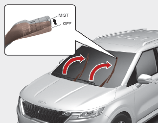 엔진 시동을 끈 후 약 20초 이내에 와이퍼가 최상단으로 올라갈 때까지 와이퍼 스위치를 약 2초 이상 「MIST」 위치로 올리십시오.
