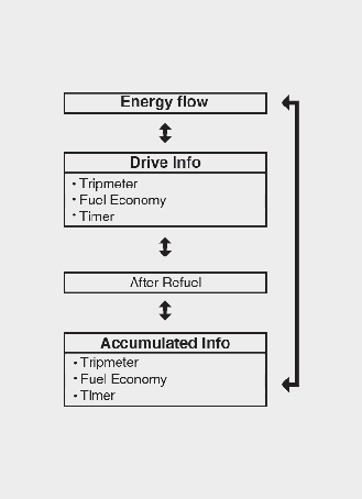 此顯示幕顯示加油後的行車距離 、平均燃油效率以及即時燃油效率(或總行駛時間 )。