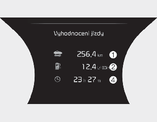 V tomto zobrazení jsou uvedené denní kilometry (1), průměrná spotřeba paliva (2) a okamžitá spotřeba paliva (3) a celková doba jízdy (4) vždy za jeden cyklus zapalování.
