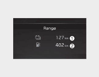 The range is the estimated distance the vehicle can be driven with the remaining high-voltage (hybrid) battery (1, Electric) and fuel in the fuel tank (2, Gasoline).