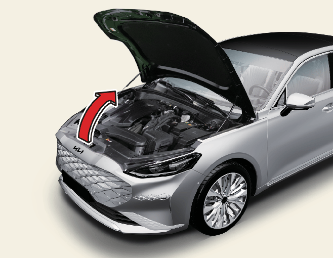 엔진 후드를 중간 정도 들어 올리면 저절로 완전히 열리게 됩니다.