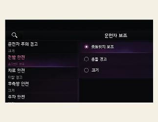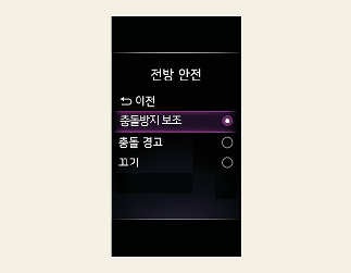 시동「ON」상태에서 설정 메뉴의 '운전자 보조→전방 안전'에서 각 기능의 사용 여부를 선택하실 수 있습니다.