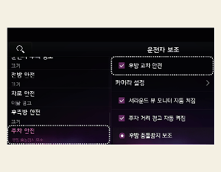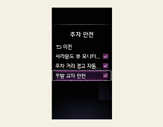 시동「ON」상태에서 설정 메뉴의 ’운전자 보조→주차 안전→후방 교차 안전’을 선택하면 기능이 켜집니다. 기능을 끄고 싶으면 선택을 해제해야 합니다.