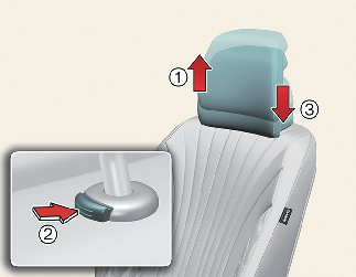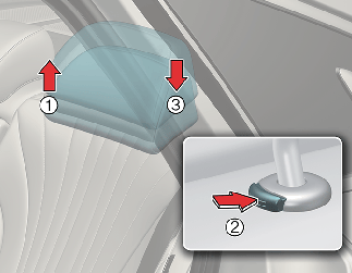 헤드레스트를 높이려면 헤드레스트를 잡고 잠기는 위치까지 위로 당겨 올리십시오(1). 헤드레스트를 낮추려면, 잠금 해제 버튼을 누른 상태에서(2) 헤드레스트를 위에서 누르십시오(3).