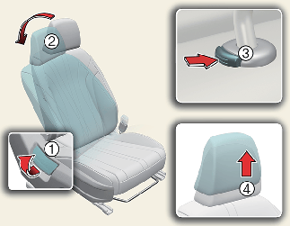 헤드레스트를 끝까지 올린 후 잠금 해제 버튼(3)을 누른 상태에서 헤드레스트를 위로 올려 분리하십시오(4).
