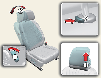 헤드레스트를 시트에서 분리할 때는 먼저 리클라이닝 레버 또는 스위치(1)로 시트 등받이를 뒤로 젖히십시오(2).
