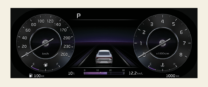 테마B는 Full LCD 타입 계기판의 사용자 설정 테마로 아날로그 형태의 계기판을 디지털화해서 보여주며 날씨, 시간에 따라 배경 화면이 변화합니다.