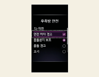 시동「ON」상태에서 설정 메뉴의 '운전자 보조→후측방 안전→안전 하차 경고'를 선택하면 기능이 켜집니다. 기능을 끄고 싶으면 선택을 해제해야 합니다.