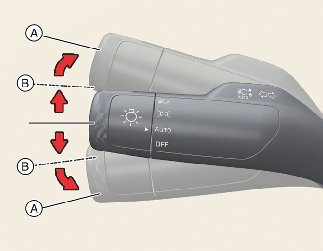 방향지시등 스위치를 B에 두면 차로 변경 보조기능을 수행합니다. 방향지시등 스위치가 중립으로 돌아가더라도 계속해서 차로 변경을 도와줍니다. 작동 상태에서는 방향지시등 스위치를 잡고 있지 않아도 내외부의 방향지시등이 깜박이며, 완료되면 자동으로 꺼집니다.
