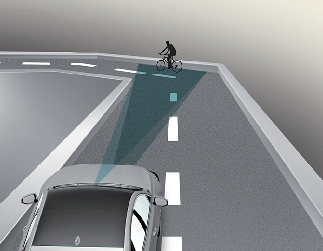 커브가 있는 길에서는 전방에 있는 차량, 보행자 및 자전거 탑승자를 인식하지 못해 전방 충돌방지 보조의 성능이 저하되어 경고, 제동 또는 조향(사양 적용 시)을 보조하지 않을 수 있습니다.