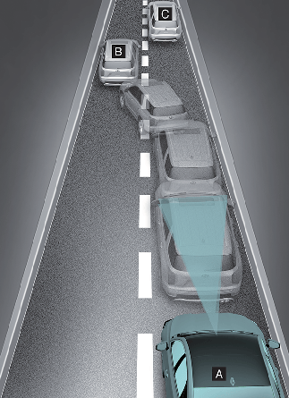 자차(A)가 정지한 상태에서 바로 앞에 있는 차량(B)이 옆 차로를 빠져나가는 경우, 같은 차로에 있는 앞 차량(C)을 인지하지 못하여 충돌 위험이 있을 수 있습니다. 항상 전방 도로 상황 및 주행 상태를 확인하고 주의하여 운전하십시오. 필요하면 브레이크 페달을 밟아 직접 속도를 조절하거나 스티어링 휠을 조작하십시오.