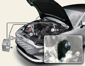 보조 배터리의 음극(-)(3)과 방전된 차량의 엔진 리프트 브래킷(4)에 점프 케이블을 연결하십시오.
