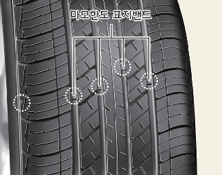 이것은 타이어 트레드부가 마모 한계에 다다랐다는 것을 의미합니다. 이때는 타이어를 교체하십시오. 편마모 등 이상 마모 현상이 나타난 타이어는 마모한도 표지밴드가 모든 트레드부에 나타나기 전이라도 교체하십시오.