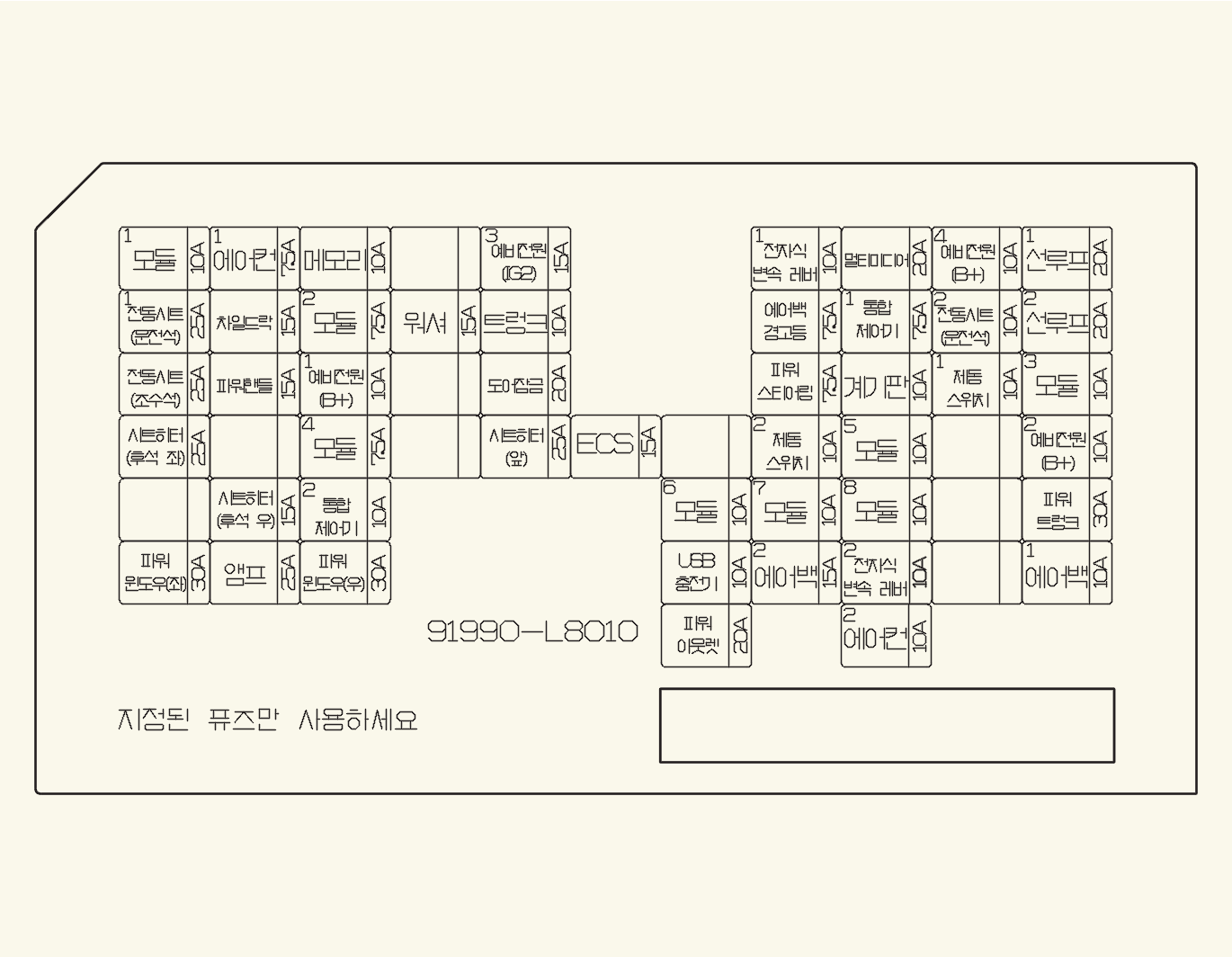 * 엔진룸 퓨즈 박스 내 이름 없는 공란 퓨즈는 예비 퓨즈가 아니므로 임의로 빼지 마십시오. 임의로 뺄 경우 해당 시스템이 작동하지 않을 수 있습니다.