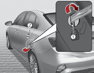 2. Introduire une clé (ou un tournevis) dans l'orifice (1) et la tourner vers la position « lock () » (verrouillage). Lorsque la serrure de sécurité pour enfants est en position de verrouillage, la porte arrière ne peut pas s’ouvrir même si la poignée intérieure est tirée.