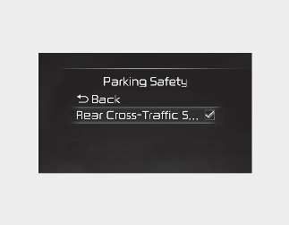 Avec le bouton ENGINE START/STOP (Marche/Arrêt du moteur) en position ON, sélectionnez « Assistance au conducteur → Sécurité de stationnement → Sécurité de circulation transversale arrière » dans le menu « Paramètres utilisateur (écran LCD) ou Paramètres → Véhicule (écran du système d'info-divertissement) » pour activer le système de sécurité de circulation transversale arrière et désélectionnez pour désactiver la fonction.