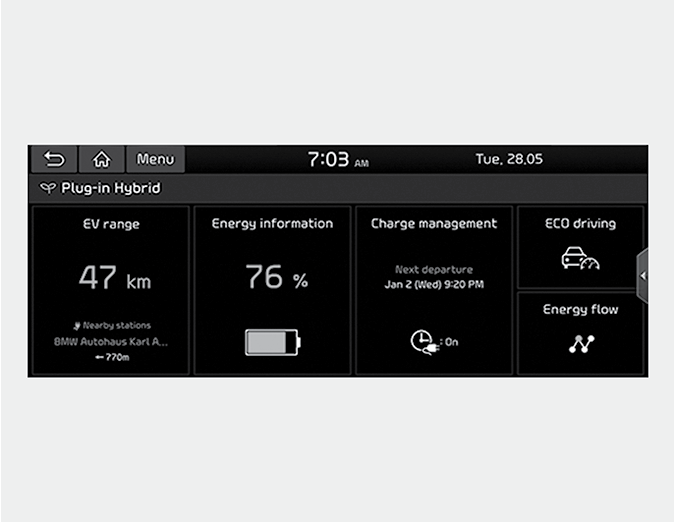 The Plug-in Hybrid menu consists of five sections: [EV range], [Energy information], [Charge management], [ECO driving], [Energy flow].