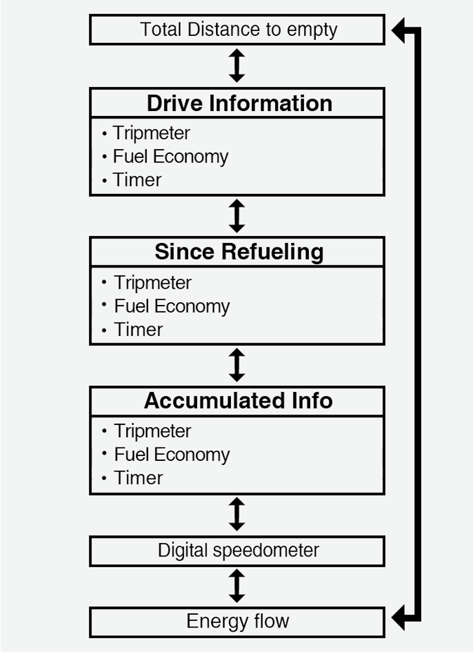 This display shows the trip distance (1), the average fuel efficiency (2), and the instant fuel economy (3), and the total driving time (4) information once per one ignition cycle.
