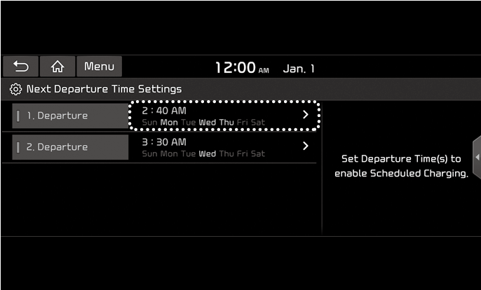 Saate seadistada väljumisaja, valides ekraanil „EV → Charge management (Laadimise haldamine) → Reserved charging and Climate control (Ajastatud laadimine ja kliimaseade) → Next departure time (Järgmine väljumisaeg) →“.