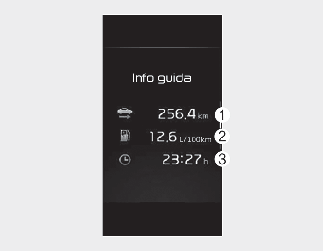 Vengono visualizzati: la distanza percorsa totale (1), il consumo medio di carburante (2) e il tempo di guida totale (3).