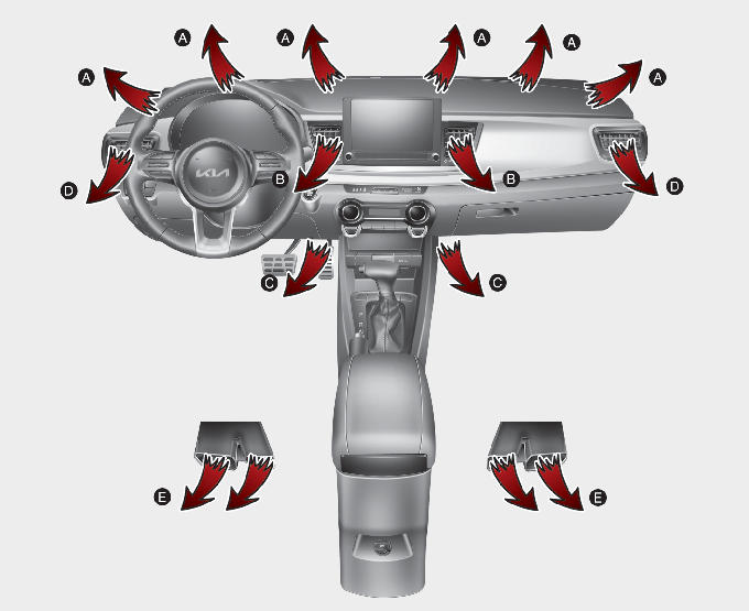 La maggior parte dell'aria viene convogliata verso il pavimento, mentre una minima quantità viene diretta verso le bocchette di sbrinamento del parabrezza e dei finestrini.