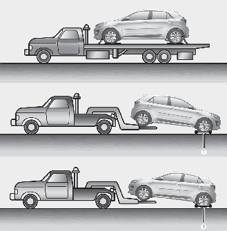 Se occorre trainare il veicolo in caso di emergenza, si raccomanda di rivolgersi a un concessionario autorizzato Kia o a un servizio di soccorso stradale. È necessario attenersi alle procedure di sollevamento e traino appropriate per prevenire danni al veicolo. Si consiglia l'uso di carrelli a ruote (1) o carro attrezzo con pianale.