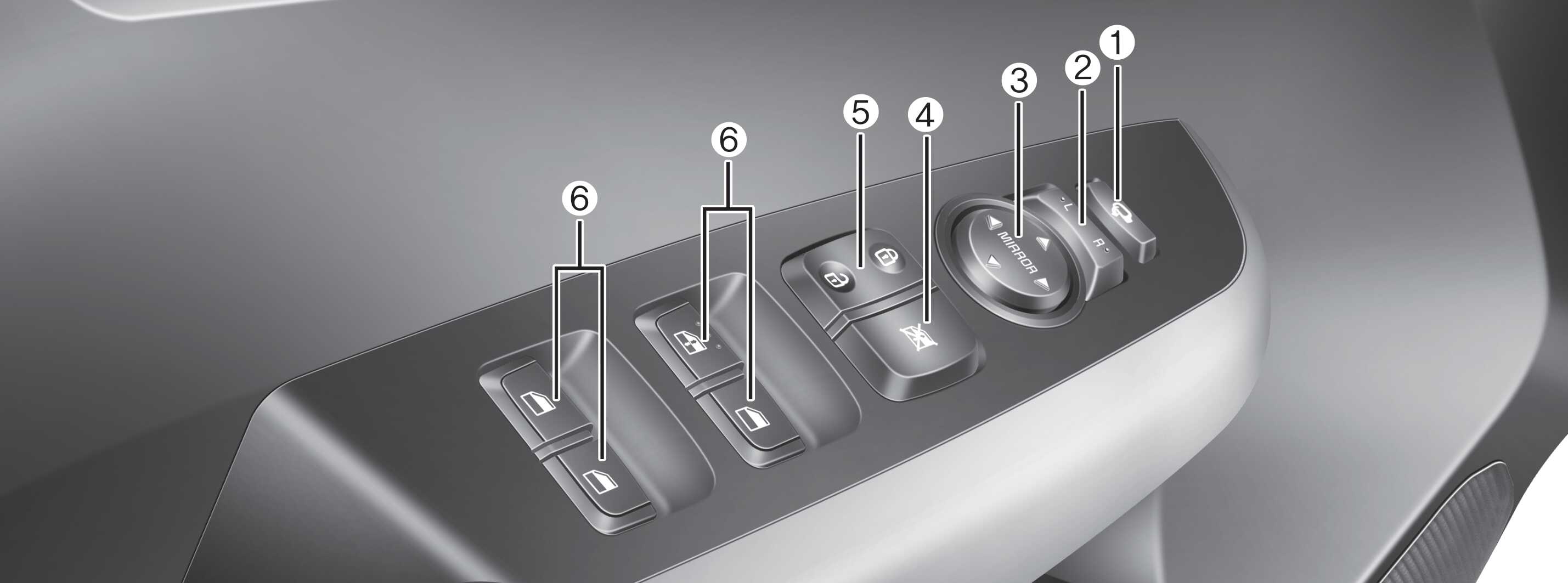 : 버튼을 눌러 잠금 상태로 하면 뒷좌석 유리창 열림/닫힘 스위치가 작동하지 않습니다.