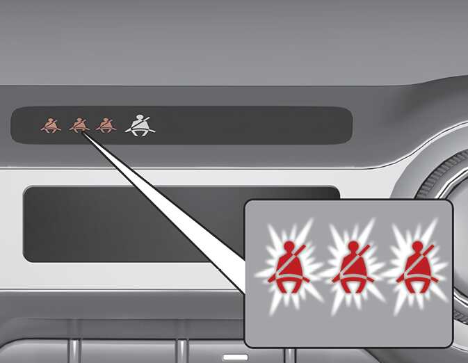 동승석 안전벨트를 착용하지 않았거나 착용한 후 주행 중 안전벨트를 풀 경우, 차량의 속도가 20 km/h 미만인 경우 경고등이 켜지며, 차량의 속도가 20 km/h 이상인 경우에는 경고등이 깜빡이며, 경고음이 100초 동안 울립니다.