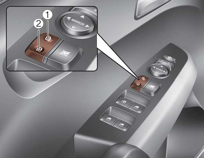 중앙 도어 잠금 스위치(1)를 누르면 모든 도어가 잠기고, (2)를 누르면 모든 도어가 잠금 해제 됩니다.
