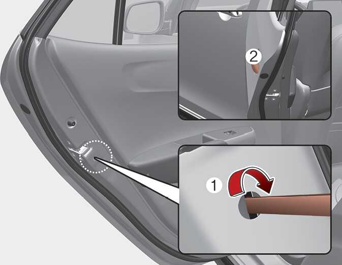 어린이 보호용 잠금 장치를 열림의 위치로 하기전까지는 도어가 잠금해제된 상태라도 차 안의 도어 핸들로 뒷도어를 열 수 없습니다.